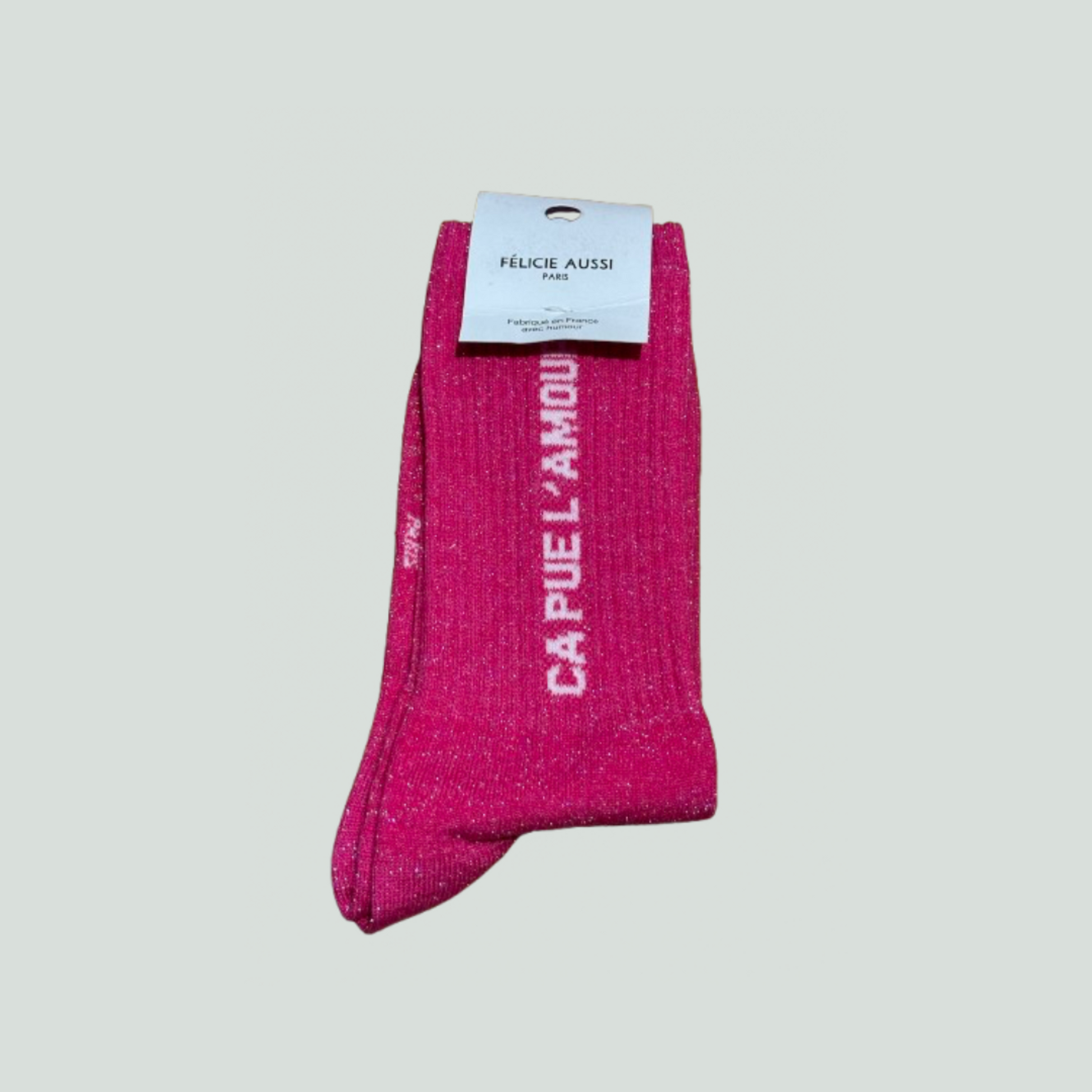 Les chaussettes à paillettes “Ça pue l’amour” de Félicie Aussi apportent une touche de fun et de glamour à ton look, tout en affichant un message décalé et irrésistible.