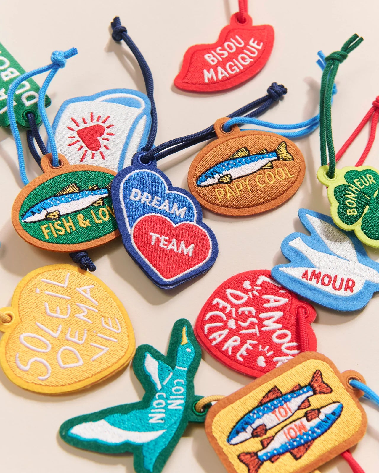 Collection de mots doux et de motifs colorés à accrocher à vos clés, vos sacs, vos passants de Jean, vos sapins de Noël, vos rétroviseurs...