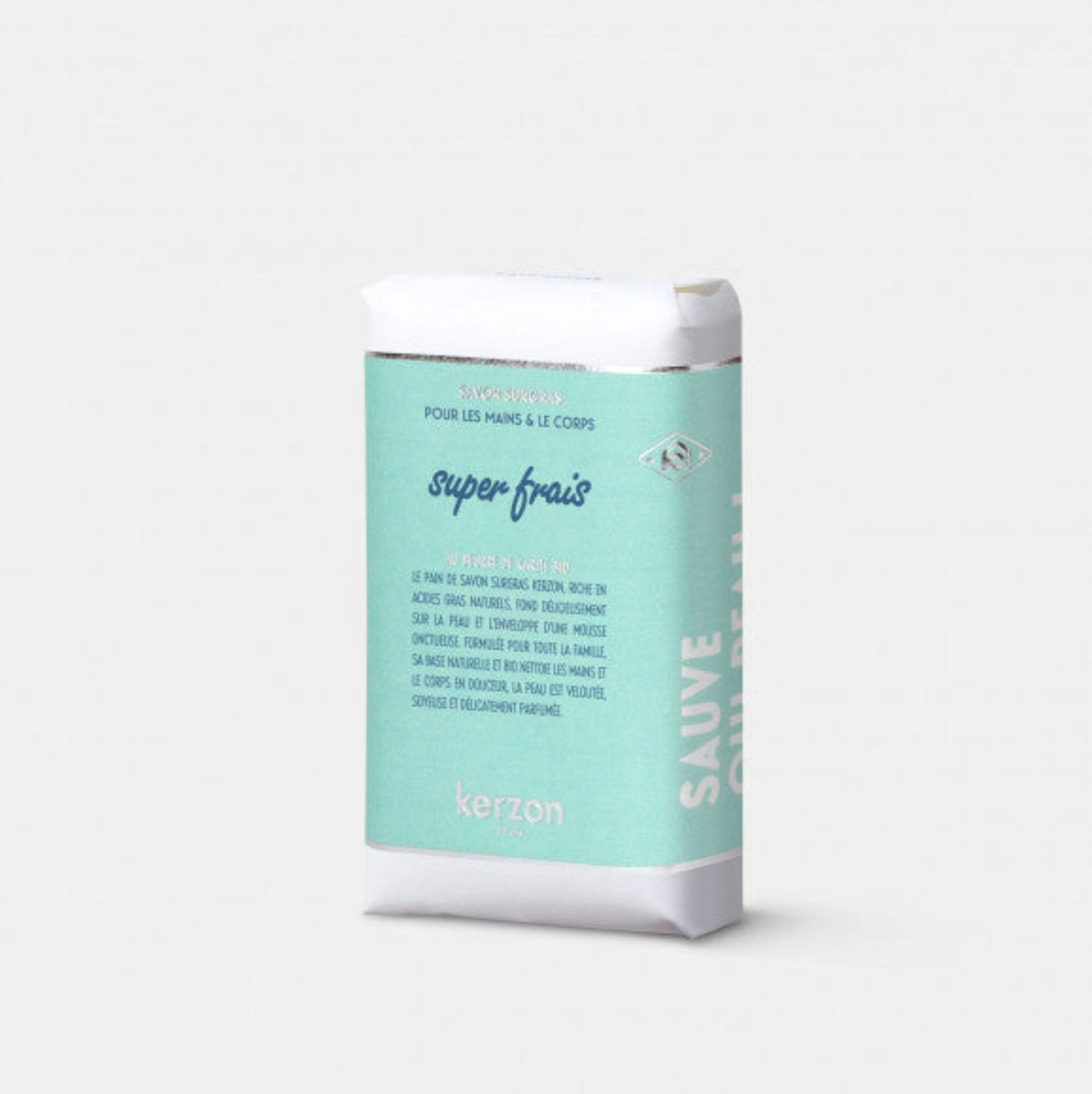 Le savon solide surgras Kerzon, riche en acides gras naturels, en beurre de karité et en huile d'amande douce bio, enveloppe la peau d’une mousse onctueuse et la parfume délicatement.