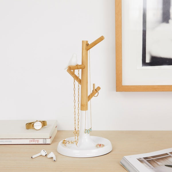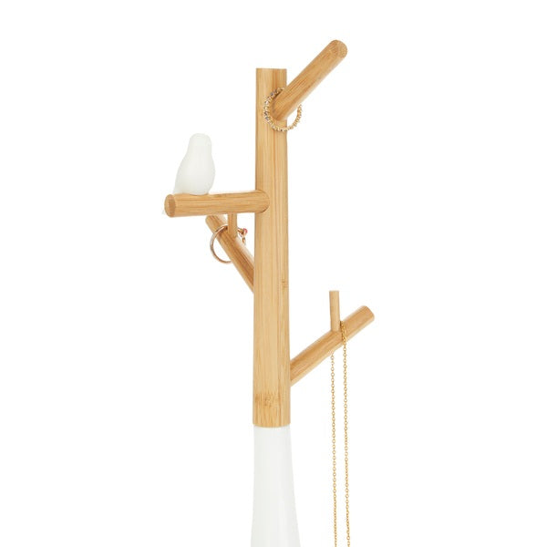 Apportez une touche de nature et d’élégance à votre intérieur avec le support à colliers Birdie de Balvi. Conçu sous la forme d’un arbre stylisé surmonté d’un oiseau, cet organisateur de bijoux en bambou et plastique allie design amusant, fonctionnalité et qualité durable.